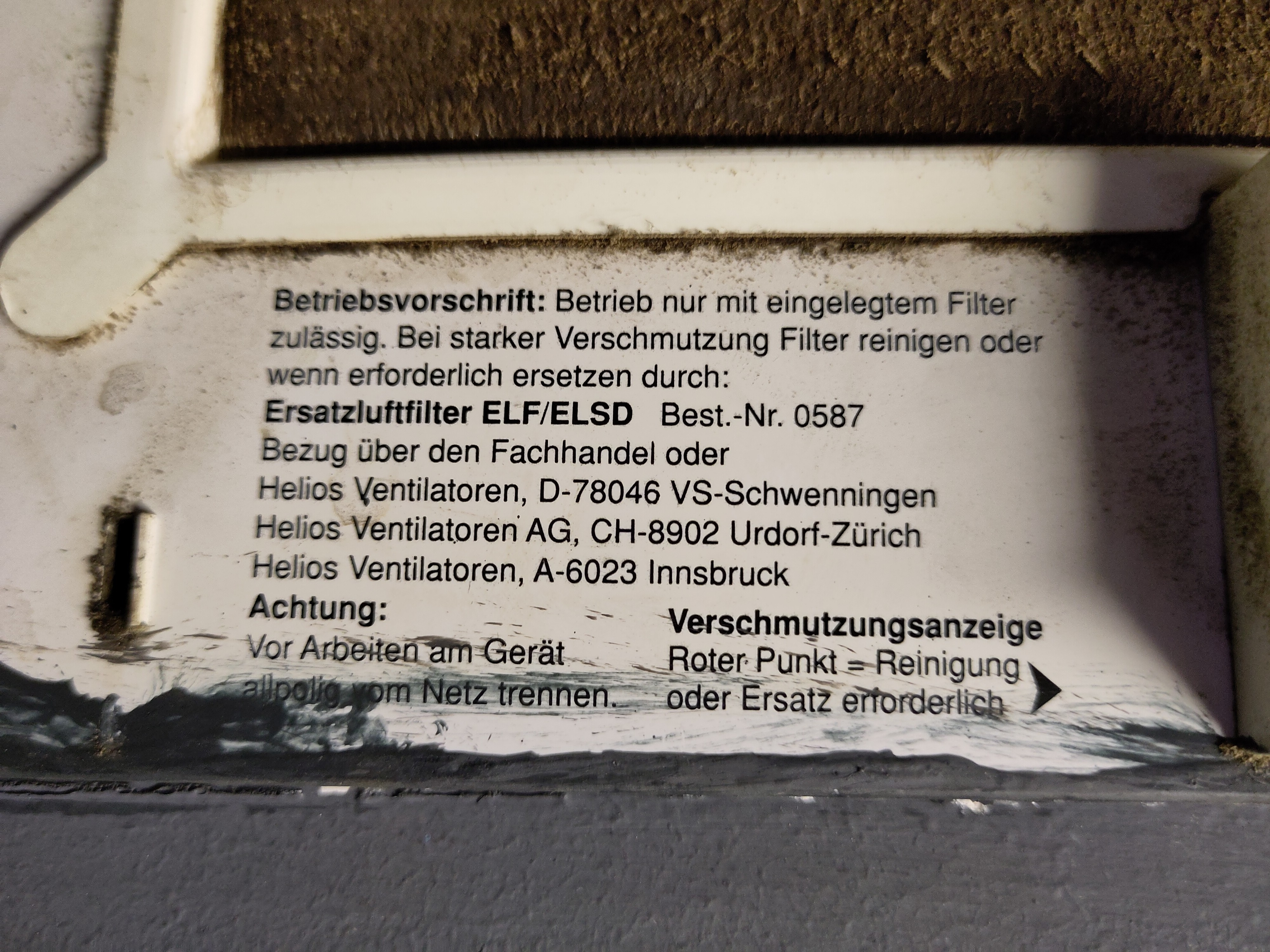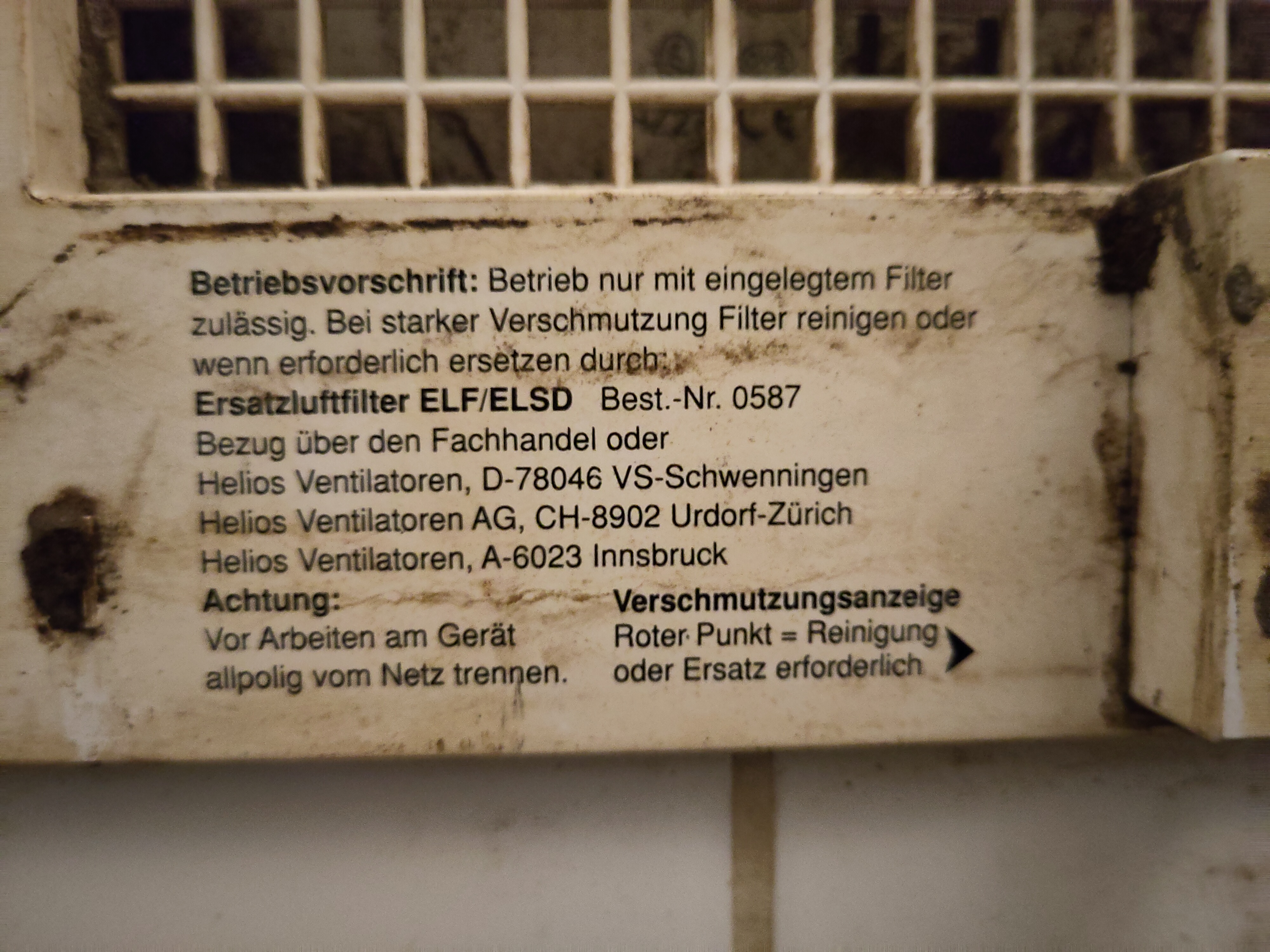 Filter im Mondrianraum (Raum mit Dusche?) wurde abgesaugt. Der Filter ist nich in relativ gutem Zustand. Aber vermutlich nur, weil der Rahmen nicht ordentlich auf der Decke sitzt und ein Großteil der Luft seitlich am Filter vorbei gezogen wird.